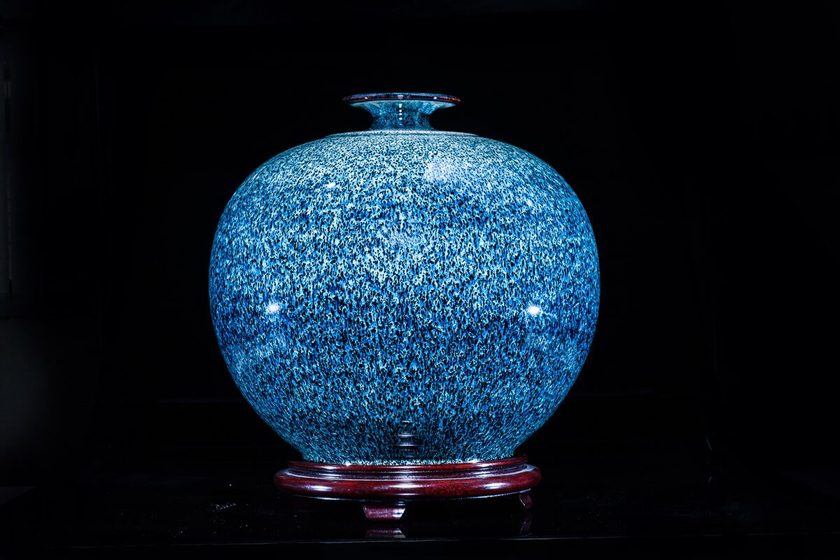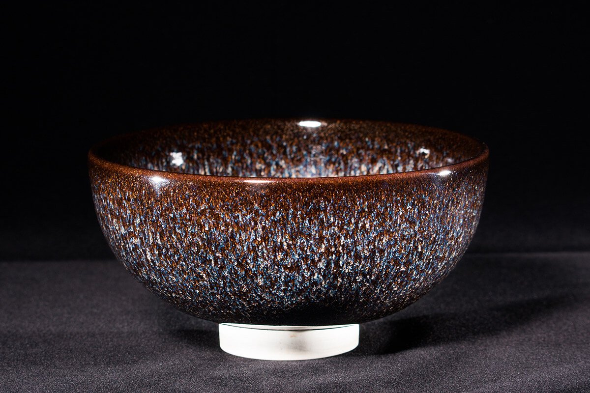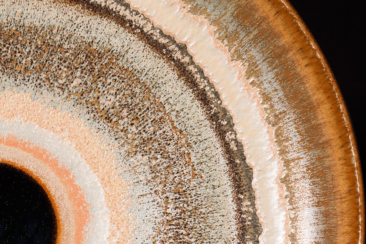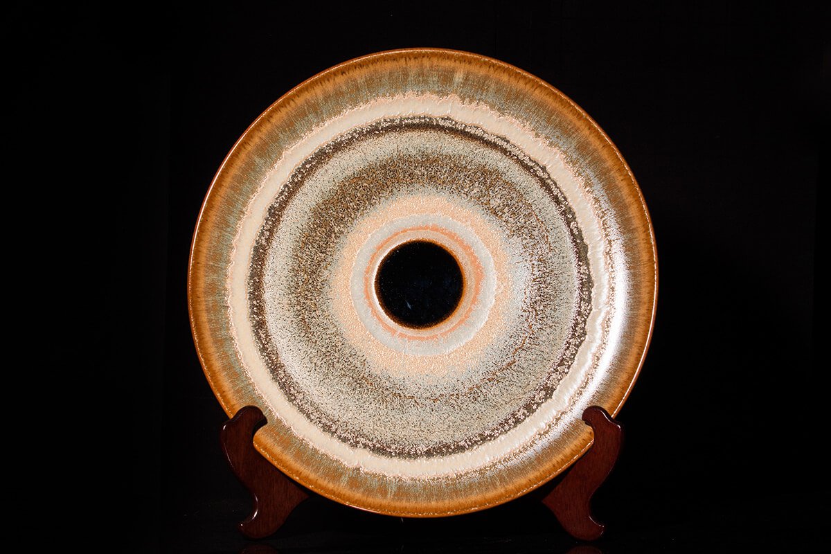 天目釉繽紛多樣的姿態,除了運用於傳統茶碗上,吳老師還將其用在各式茶具、盤、瓶和壺上,近期更將天目釉表現在大型的創作品上,隨著體積的增大其難度也隨之倍增,但吳老