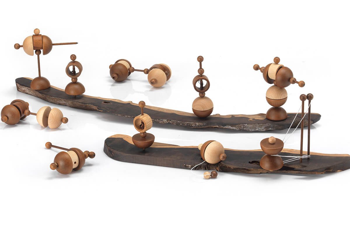 在經過一番的調查與探索,決定以木頭工藝來創作現代玩器,並與小麥文化作為傳承的連結。為了使商品更具工藝價值,張老師不斷的改良研究以栓接組裝不需膠合的工法,最終研發出一組可自由拆組的台灣童玩樂高。