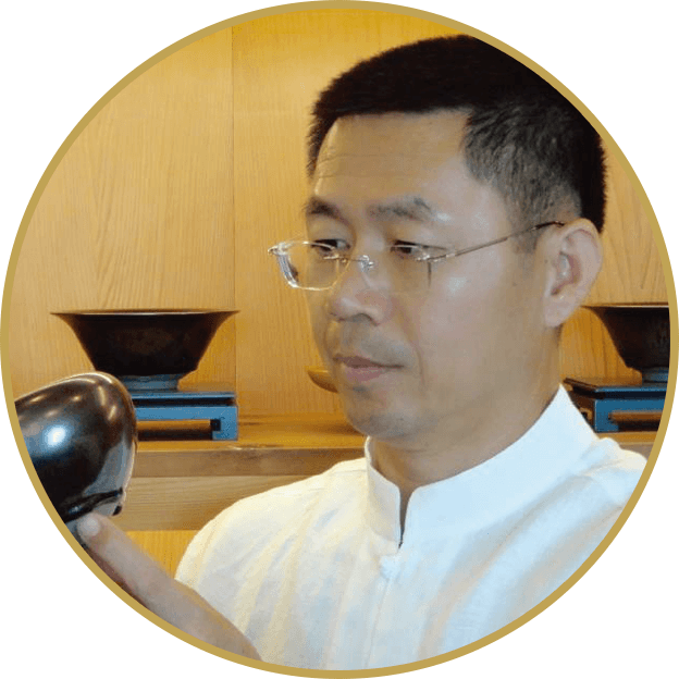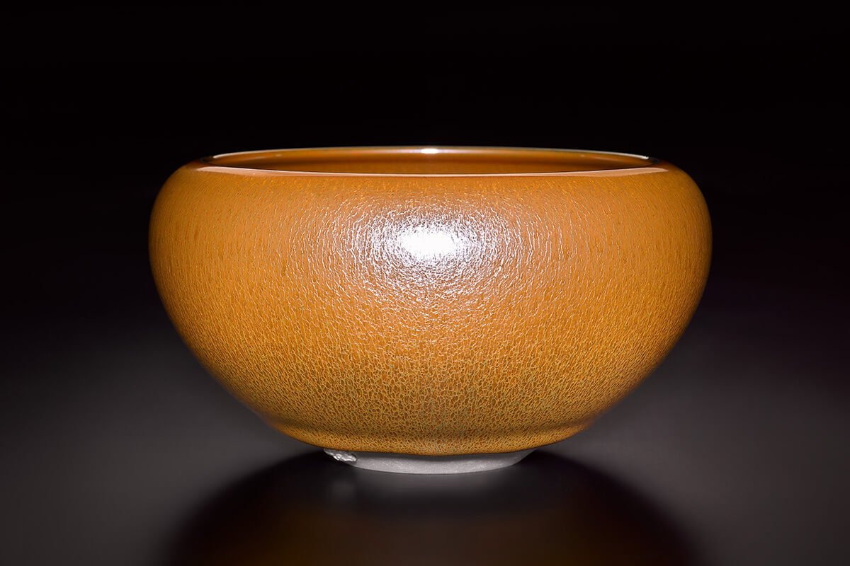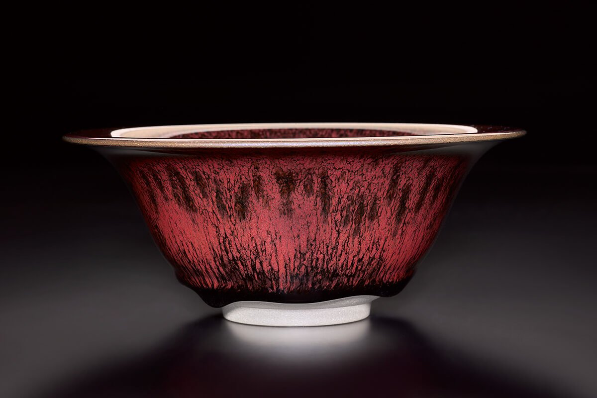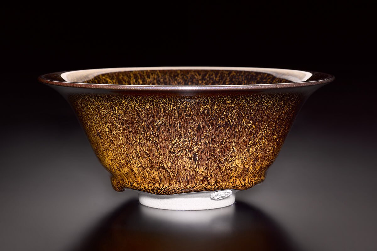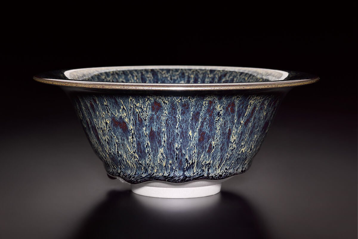江有庭老師自1984年開始專攻天目茶碗,從不知天目燒出天目,從燒出天目變化天目,藉著火的力量燒出一片璀璨。以單味氧化鐵,採單掛釉方式燒製,燒出繽紛色彩,其色澤與紋樣隨著光線的強弱與照映的角度而變幻萬千,猶如來自蒼穹的耀動藏在茶碗的世界中,遂得「藏色天目」之名。