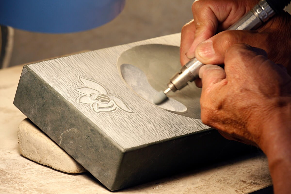 董坐石硯的負責人董坐老師是第二代傳承的工藝師,從小跟著父親學習石硯雕刻技法,並加以發揚光大,百龍石硯即是他的代表作,其後又陸續的創作新題材,將生活中所經歷的點滴融入作品之中。兩位兒子董嘉靖及董家豪也不負期望,在石硯雕刻這條路上追隨父親的腳步,並創出了各自新的領域,三代傳承,每一代都有技術上的突破與創新。